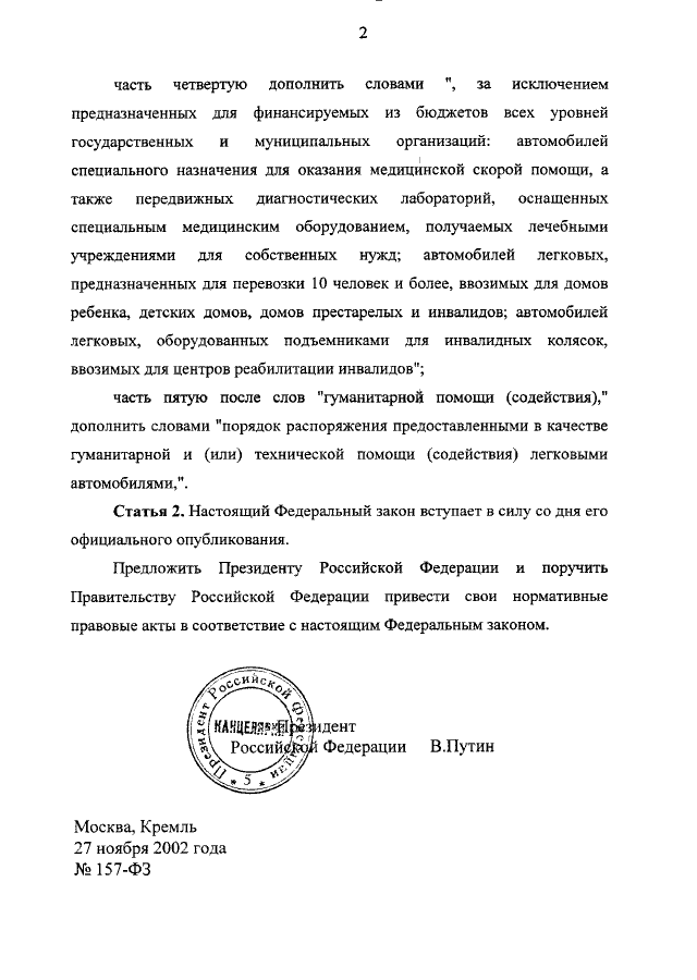 ФЕДЕРАЛЬНЫЙ ЗАКОН от 27.11.2002 N 157-ФЗ "О ВНЕСЕНИИ ДОПОЛНЕНИЙ В ФЕДЕРАЛЬНЫЙ ЗАКОН "О БЕЗВОЗМЕЗДНОЙ ПОМОЩИ