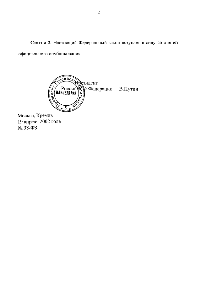 ФЕДЕРАЛЬНЫЙ ЗАКОН от 19.04.2002 N 38-ФЗ
