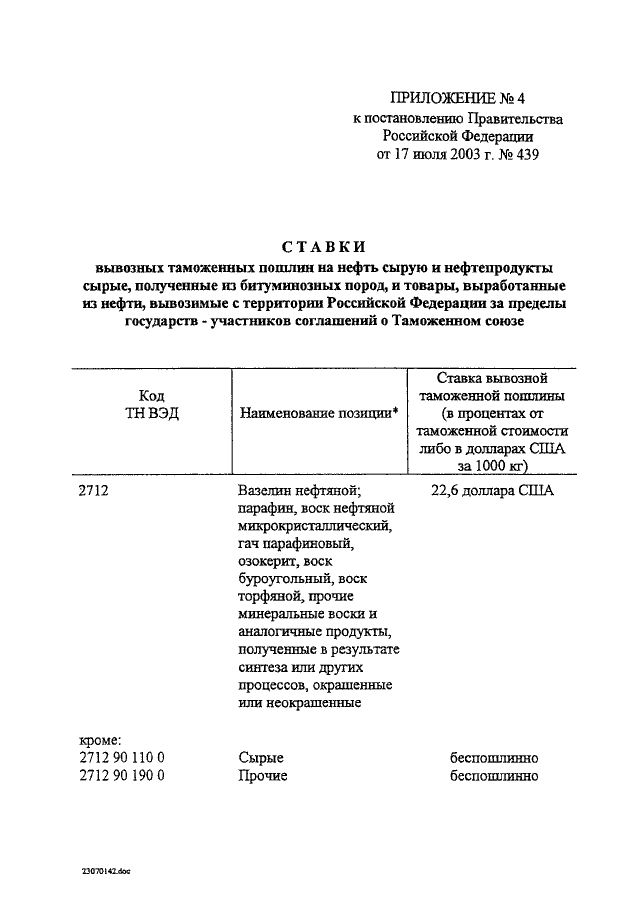 ПОСТАНОВЛЕНИЕ Правительства РФ от 17.07.2003 N 439 "ОБ УТВЕРЖДЕНИИ СТАВОК ВЫВОЗНЫХ ТАМОЖЕННЫХ ПОШЛИН НА НЕФТЬ СЫРУЮ И