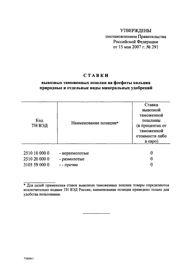 "ОБ УТВЕРЖДЕНИИ СТАВОК ВЫВОЗНЫХ ТАМОЖЕННЫХ ПОШЛИН НА ФОСФАТЫ КАЛЬЦИЯ ПРИРОДНЫЕ И ОТДЕЛЬНЫЕ ВИДЫ МИНЕРАЛЬНЫХ УДОБРЕНИЙ"