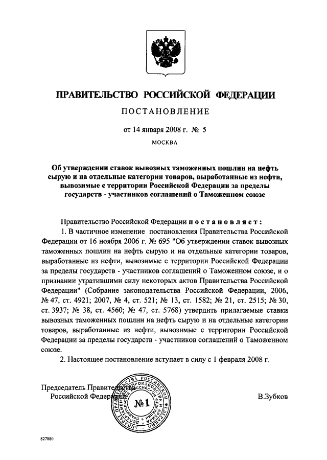 ПОСТАНОВЛЕНИЕ Правительства РФ от 14.01.2008 N 5 "ОБ УТВЕРЖДЕНИИ СТАВОК ВЫВОЗНЫХ ТАМОЖЕННЫХ ПОШЛИН НА НЕФТЬ СЫРУЮ И