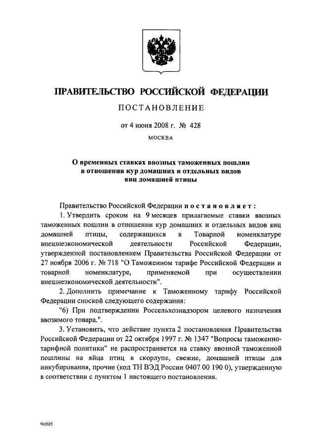 "О ВРЕМЕННЫХ СТАВКАХ ВВОЗНЫХ ТАМОЖЕННЫХ ПОШЛИН В ОТНОШЕНИИ КУР ДОМАШНИХ И ОТДЕЛЬНЫХ ВИДОВ ЯИЦ ДОМАШНЕЙ ПТИЦЫ"