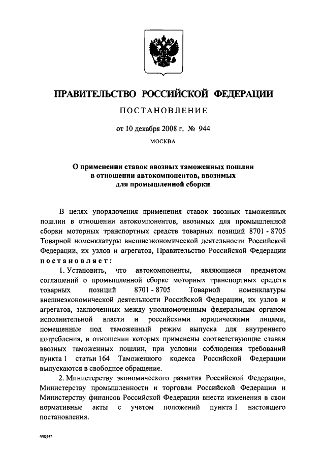 ПОСТАНОВЛЕНИЕ Правительства РФ от 10.12.2008 N 944