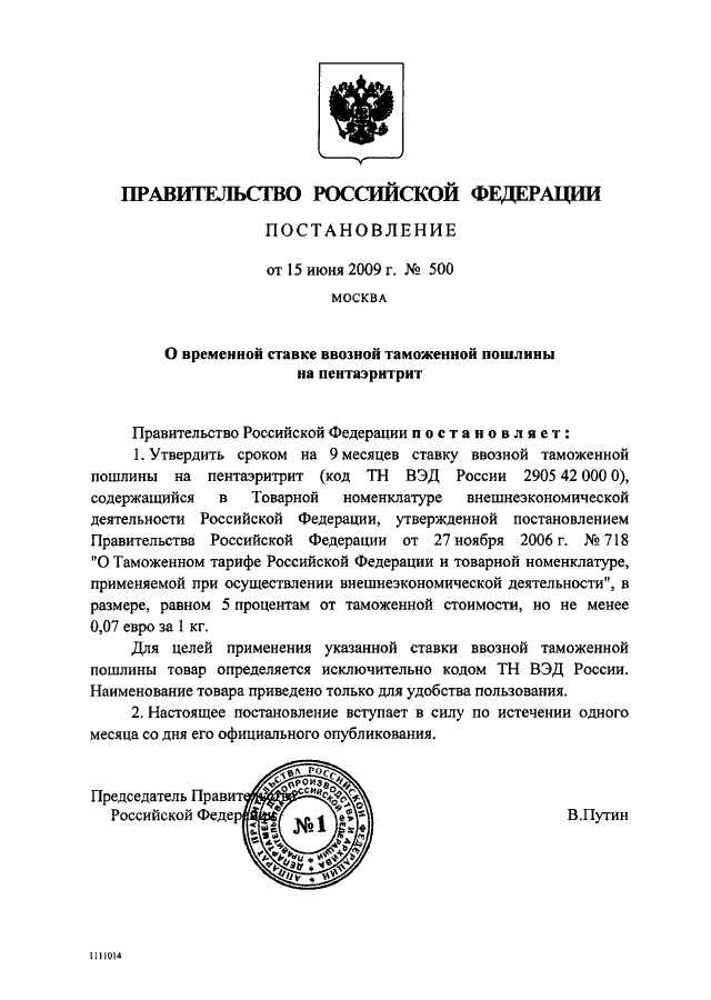 "О ВРЕМЕННОЙ СТАВКЕ ВВОЗНОЙ ТАМОЖЕННОЙ ПОШЛИНЫ НА ПЕНТАЭРИТРИТ"