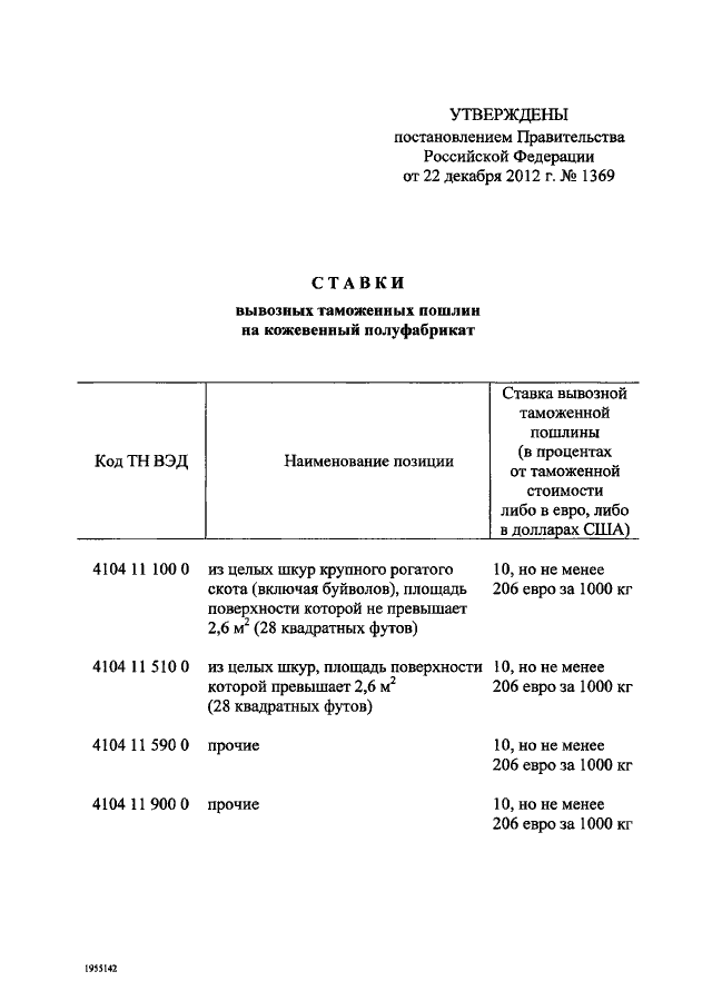 "О СТАВКАХ ВЫВОЗНЫХ ТАМОЖЕННЫХ ПОШЛИН НА КОЖЕВЕННЫЙ ПОЛУФАБРИКАТ"