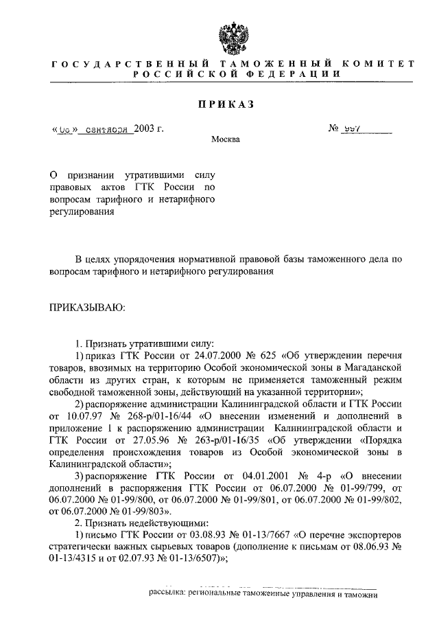 ПРИКАЗ ГТК РФ от 08.09.2003 N 997