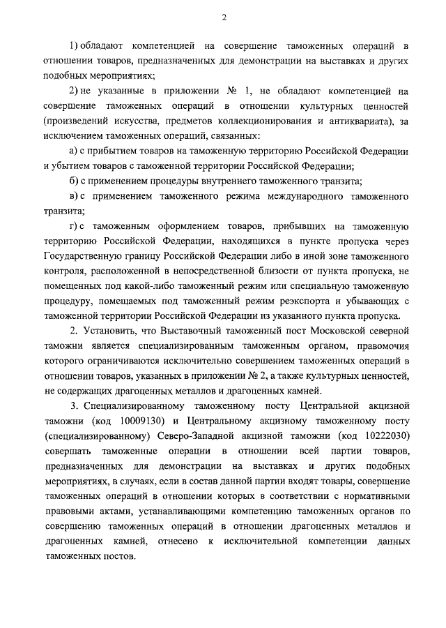 "ОБ УСТАНОВЛЕНИИ КОМПЕТЕНЦИИ ТАМОЖЕННЫХ ОРГАНОВ, РАСПОЛОЖЕННЫХ В МОСКВЕ И МОСКОВСКОЙ ОБЛАСТИ, В САНКТ-ПЕТЕРБУРГЕ И ЛЕНИНГРАДСКОЙ ОБЛАСТИ, ПО СОВЕРШЕНИЮ ТАМОЖЕННЫХ ОПЕРАЦИЙ В ОТНОШЕНИИ ТОВАРОВ, ПРЕДНАЗНАЧЕННЫХ ДЛЯ ДЕМОНСТРАЦИИ НА ВЫСТАВКАХ, ЯРМАРКАХ, МЕЖДУНАРОДНЫХ ВСТРЕЧАХ И ДРУГИХ ПОДОБНЫХ МЕРОПРИЯТИЯХ, А ТАКЖЕ КУЛЬТУРНЫХ ЦЕННОСТЕЙ"