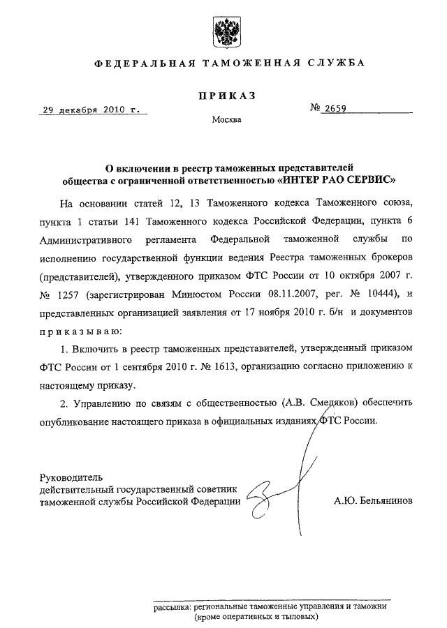 ПРИКАЗ ФТС РФ от 29.12.2010 N 2659