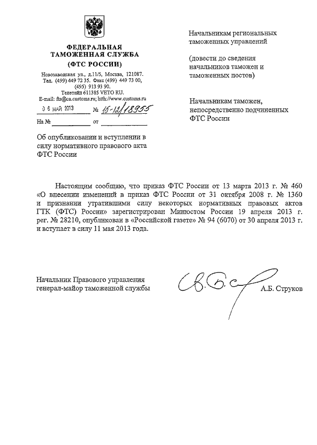 "ОБ ОПУБЛИКОВАНИИ И ВСТУПЛЕНИИ В СИЛУ НОРМАТИВНОГО ПРАВОВОГО АКТА ФТС РОССИИ"