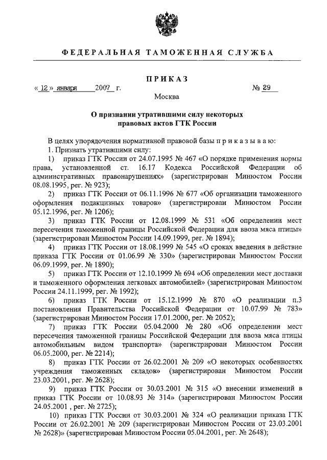 ПРИКАЗ ФТС РФ от 12.01.2007 N 29