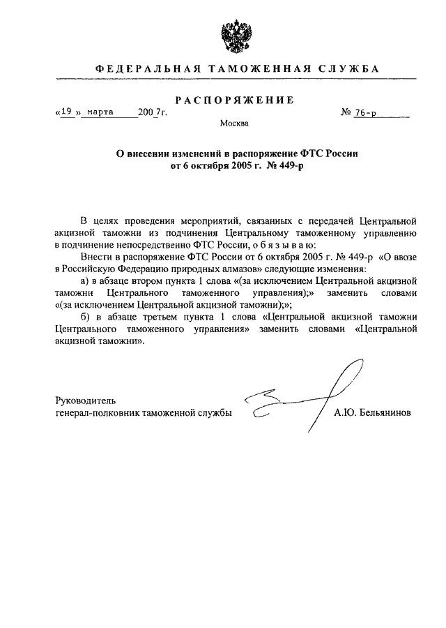 РАСПОРЯЖЕНИЕ ФТС РФ от 19.03.2007 N 76-р