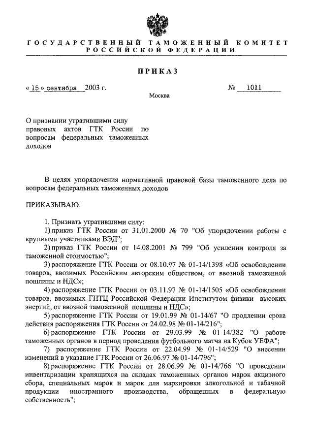 ПРИКАЗ ГТК РФ от 15.09.2003 N 1011