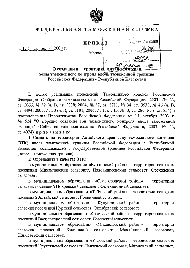 "О СОЗДАНИИ НА ТЕРРИТОРИИ АЛТАЙСКОГО КРАЯ ЗОНЫ ТАМОЖЕННОГО КОНТРОЛЯ ВДОЛЬ ТАМОЖЕННОЙ ГРАНИЦЫ РОССИЙСКОЙ ФЕДЕРАЦИИ С РЕСПУБЛИКОЙ КАЗАХСТАН"