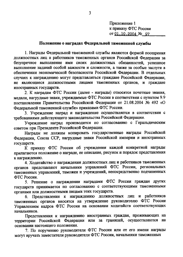 ПРИКАЗ ФТС РФ от 01.10.2004 N 97