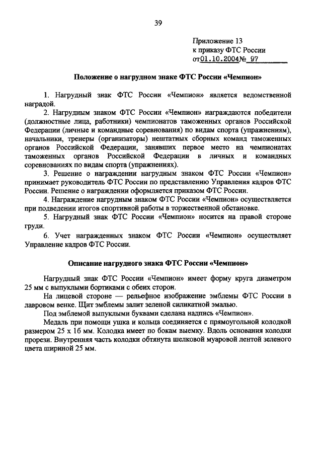 ПРИКАЗ ФТС РФ от 01.10.2004 N 97