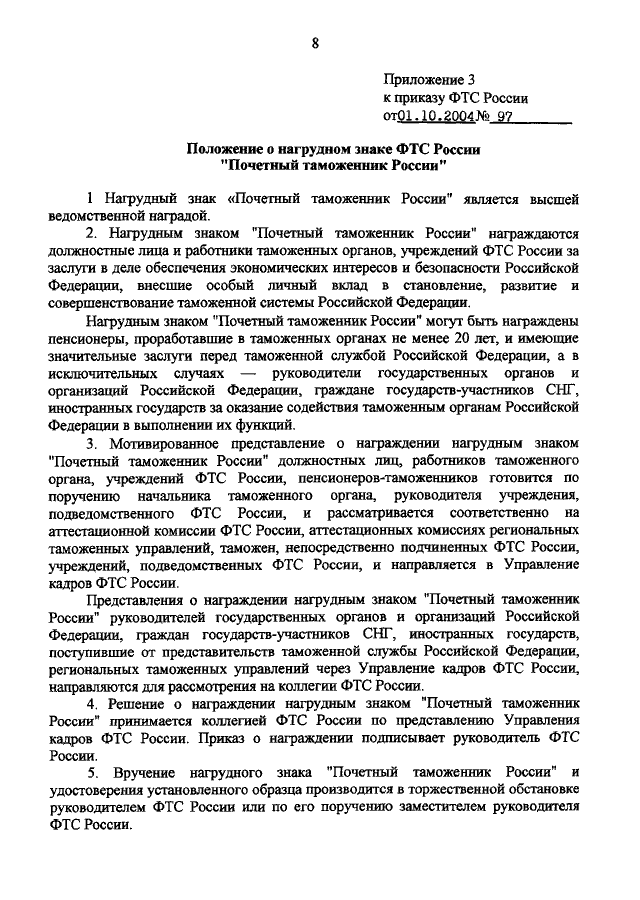 ПРИКАЗ ФТС РФ от 01.10.2004 N 97