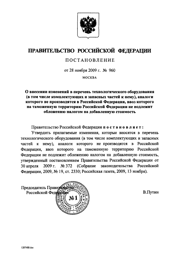 ПОСТАНОВЛЕНИЕ Правительства РФ от 28.11.2009 N 960