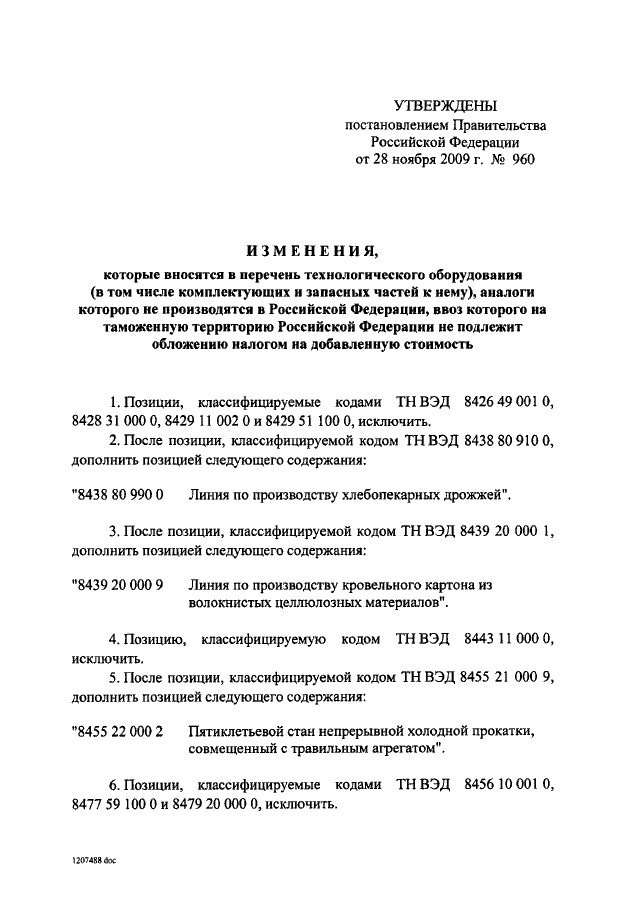 "О ВНЕСЕНИИ ИЗМЕНЕНИЙ В ПЕРЕЧЕНЬ ТЕХНОЛОГИЧЕСКОГО ОБОРУДОВАНИЯ (В ТОМ ЧИСЛЕ КОМПЛЕКТУЮЩИХ И ЗАПАСНЫХ ЧАСТЕЙ К НЕМУ), АНАЛОГИ КОТОРОГО НЕ ПРОИЗВОДЯТСЯ В РОССИЙСКОЙ ФЕДЕРАЦИИ, ВВОЗ КОТОРОГО НА ТАМОЖЕННУЮ ТЕРРИТОРИЮ РОССИЙСКОЙ ФЕДЕРАЦИИ НЕ ПОДЛЕЖИТ ОБЛОЖЕНИЮ НАЛОГОМ НА ДОБАВЛЕННУЮ СТОИМОСТЬ"