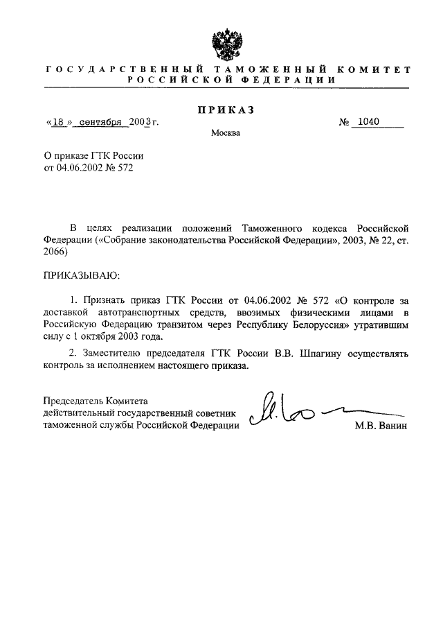 ПРИКАЗ ГТК РФ от 18.09.2003 N 1040