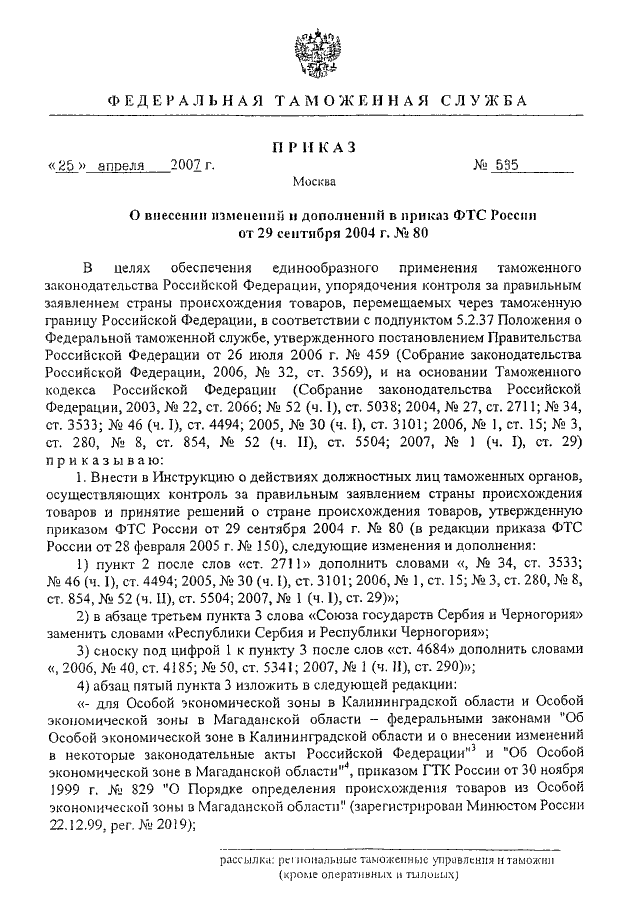"О ВНЕСЕНИИ ИЗМЕНЕНИЙ И ДОПОЛНЕНИЙ В ПРИКАЗ ФТС РОССИИ ОТ 29 СЕНТЯБРЯ 2004 Г. N 80"