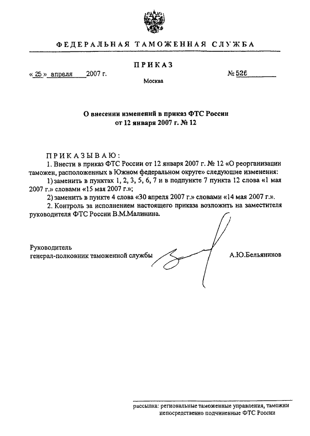 ПРИКАЗ ФТС РФ от 25.04.2007 N 526