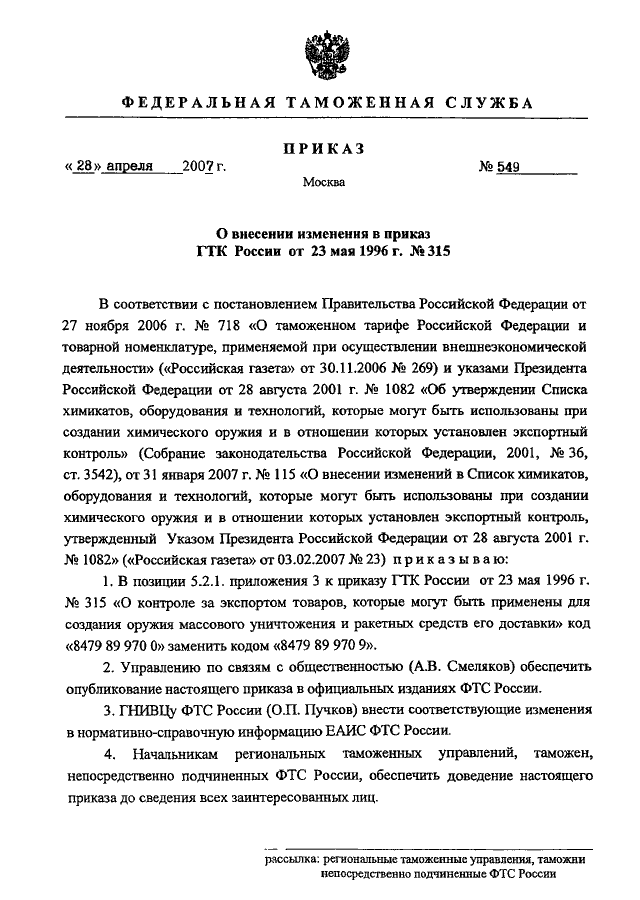ПРИКАЗ ФТС РФ от 28.04.2007 N 549
