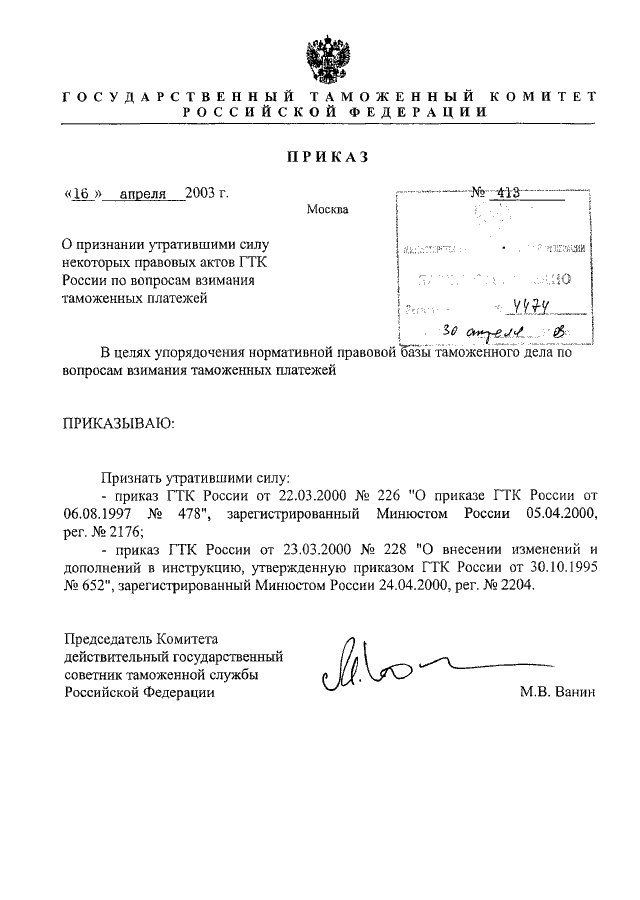 ПРИКАЗ ГТК РФ от 16.04.2003 N 413