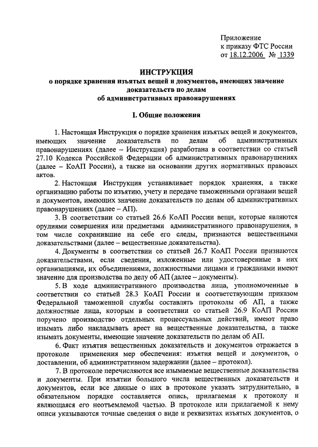 ПРИКАЗ ФТС РФ от 18.12.2006 N 1339