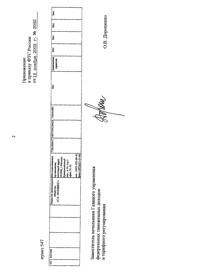 ПРИКАЗ ФТС РФ от 18.11.2009 N 2092
