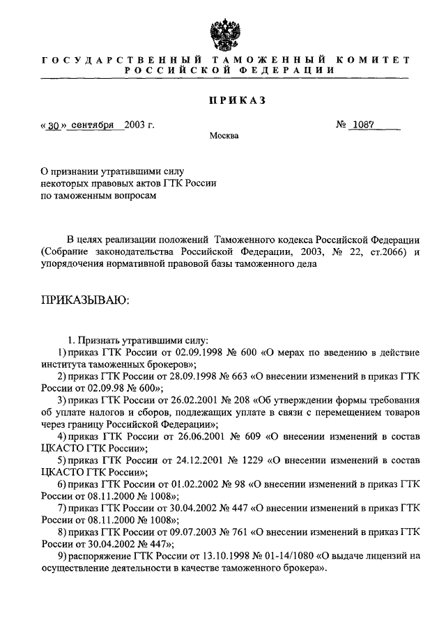ПРИКАЗ ГТК РФ от 30.09.2003 N 1087