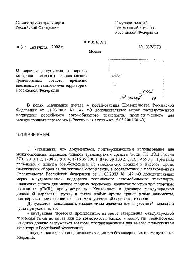 ПРИКАЗ Минтранса РФ N 187, ГТК РФ N 970 от 08.09.2003 "О ПЕРЕЧНЕ ДОКУМЕНТОВ И ПОРЯДКЕ КОНТРОЛЯ ЦЕЛЕВОГО ИСПОЛЬЗОВАНИЯ