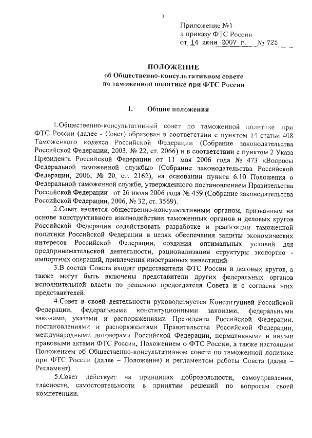 ПРИКАЗ ФТС РФ от 14.06.2007 N 725