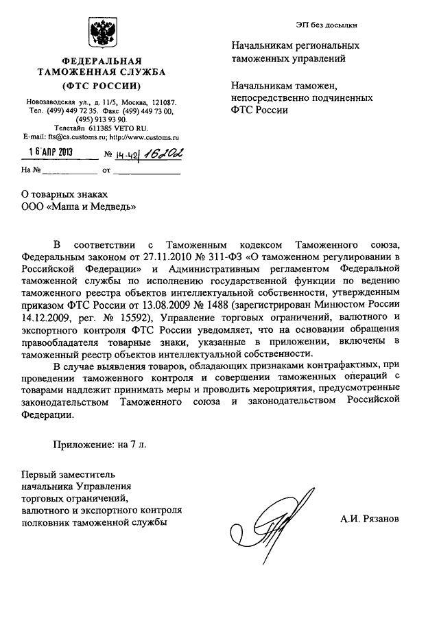 ПИСЬМО ФТС РФ от 16.04.2013 N 14-42/16202