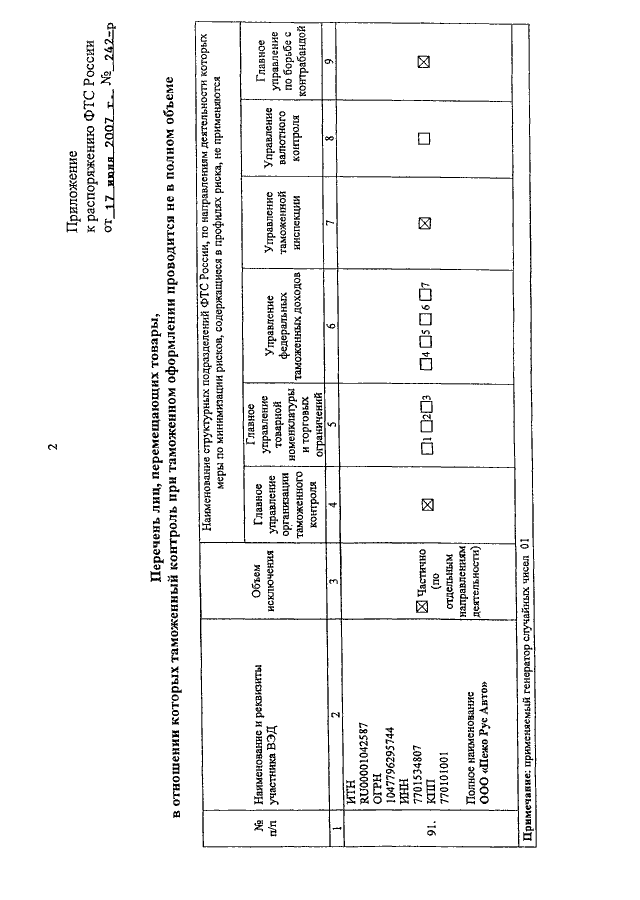 РАСПОРЯЖЕНИЕ ФТС РФ от 17.07.2007 N 242-р