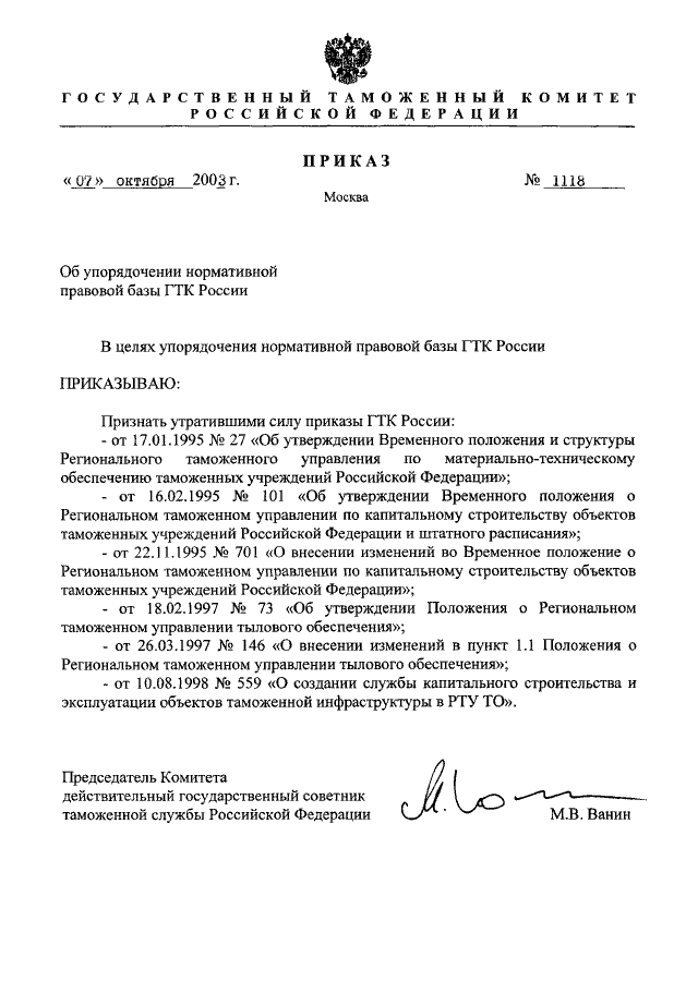 ПРИКАЗ ГТК РФ от 07.10.2003 N 1118