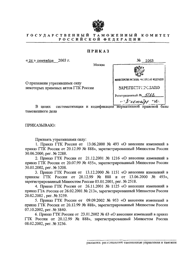 ПРИКАЗ ГТК РФ от 26.09.2003 N 1063