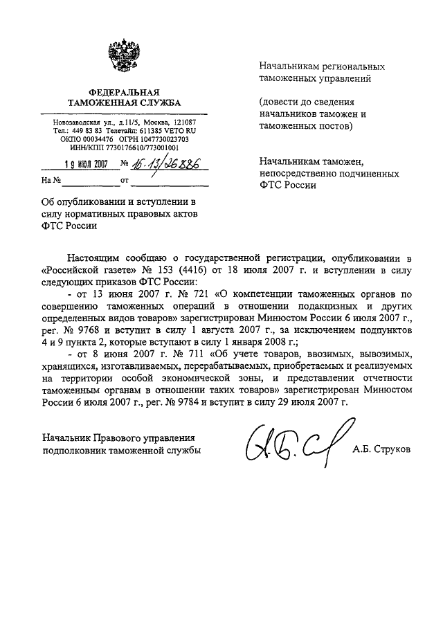 "ОБ ОПУБЛИКОВАНИИ И ВСТУПЛЕНИИ В СИЛУ НОРМАТИВНЫХ ПРАВОВЫХ АКТОВ ФТС РОССИИ"