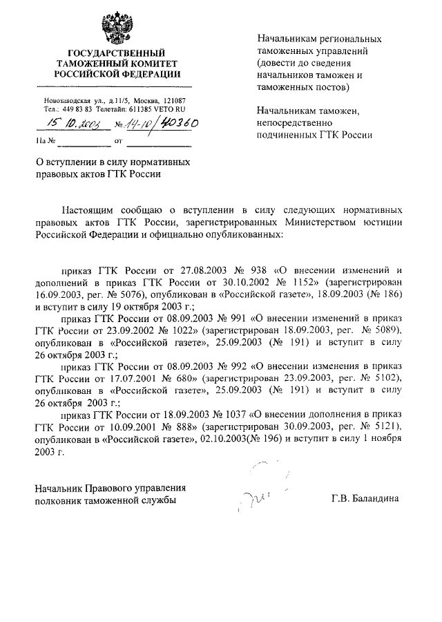 ПИСЬМО ГТК РФ от 15.10.2003 N 14-10/40360
