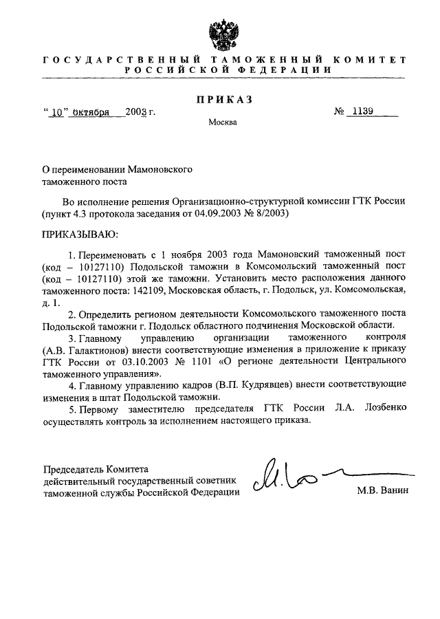 ПРИКАЗ ГТК РФ от 10.10.2003 N 1139
