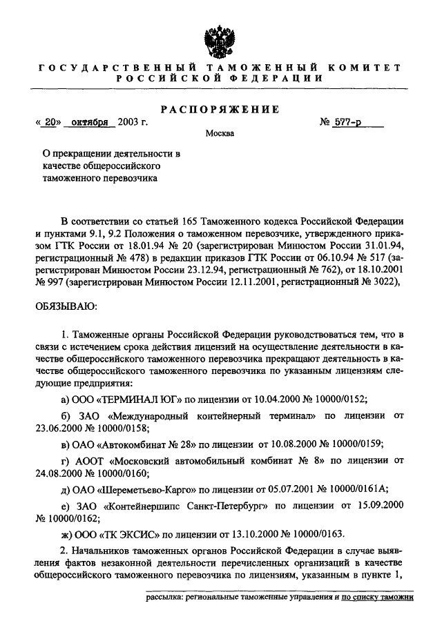 РАСПОРЯЖЕНИЕ ГТК РФ от 20.10.2003 N 577-р