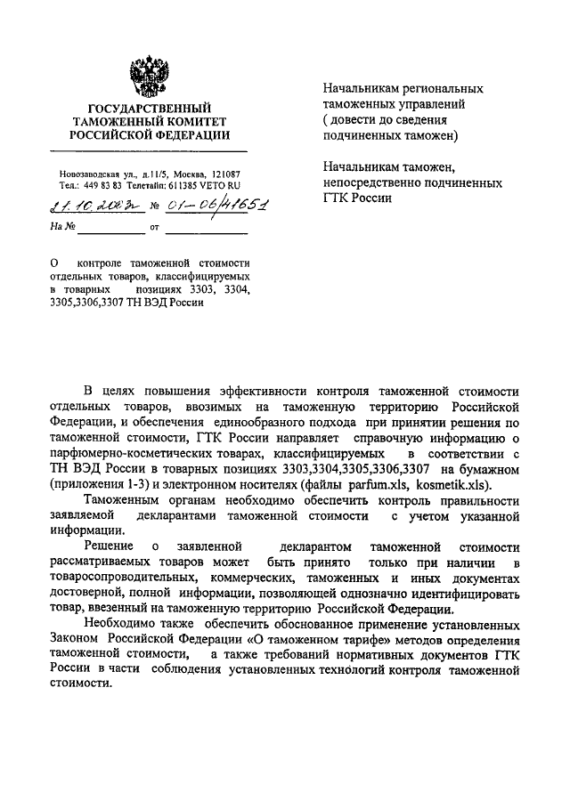 "О КОНТРОЛЕ ТАМОЖЕННОЙ СТОИМОСТИ ОТДЕЛЬНЫХ ТОВАРОВ, КЛАССИФИЦИРУЕМЫХ В ТОВАРНЫХ ПОЗИЦИЯХ 3303, 3304, 3305, 3306, 3307 ТН ВЭД РОССИИ"