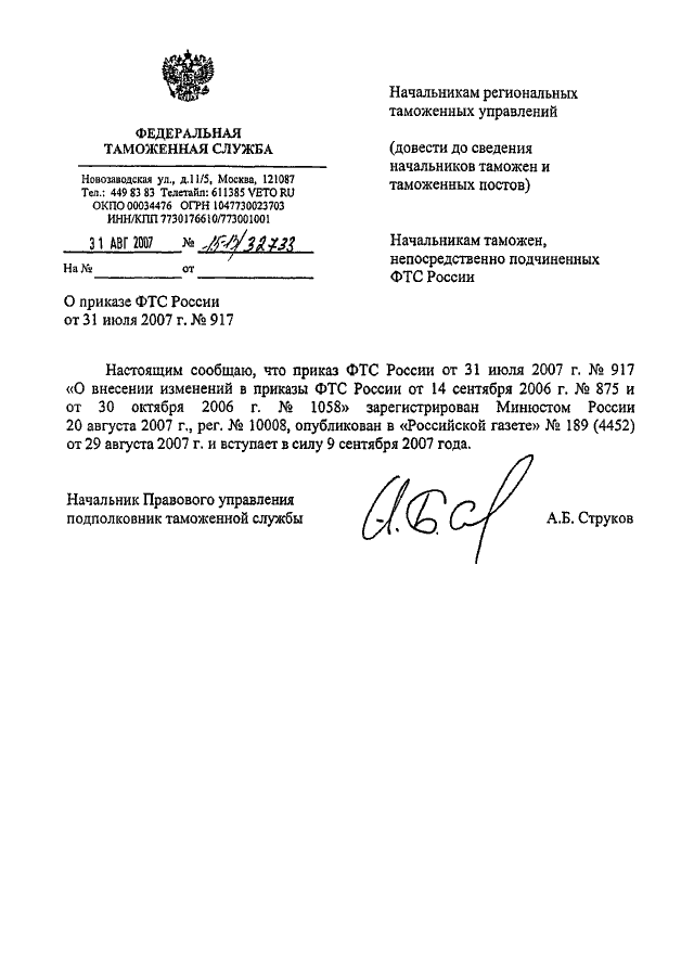 "О ПРИКАЗЕ ФТС РОССИИ ОТ 31 ИЮЛЯ 2007 Г. N 917"