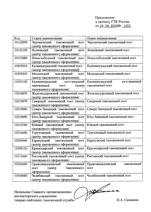 ПРИКАЗ ГТК РФ от 26.09.2003 N 1072