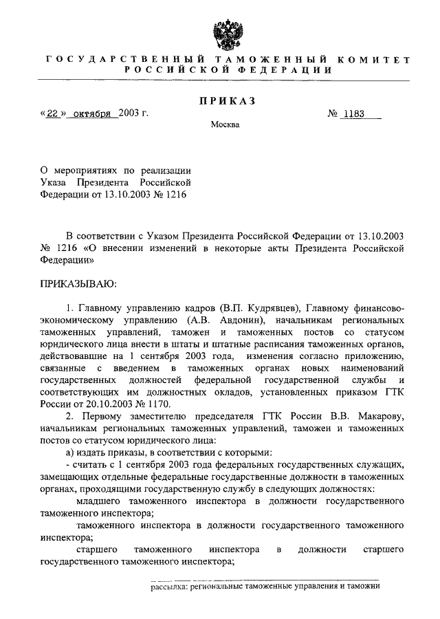 ПРИКАЗ ГТК РФ от 22.10.2003 N 1183
