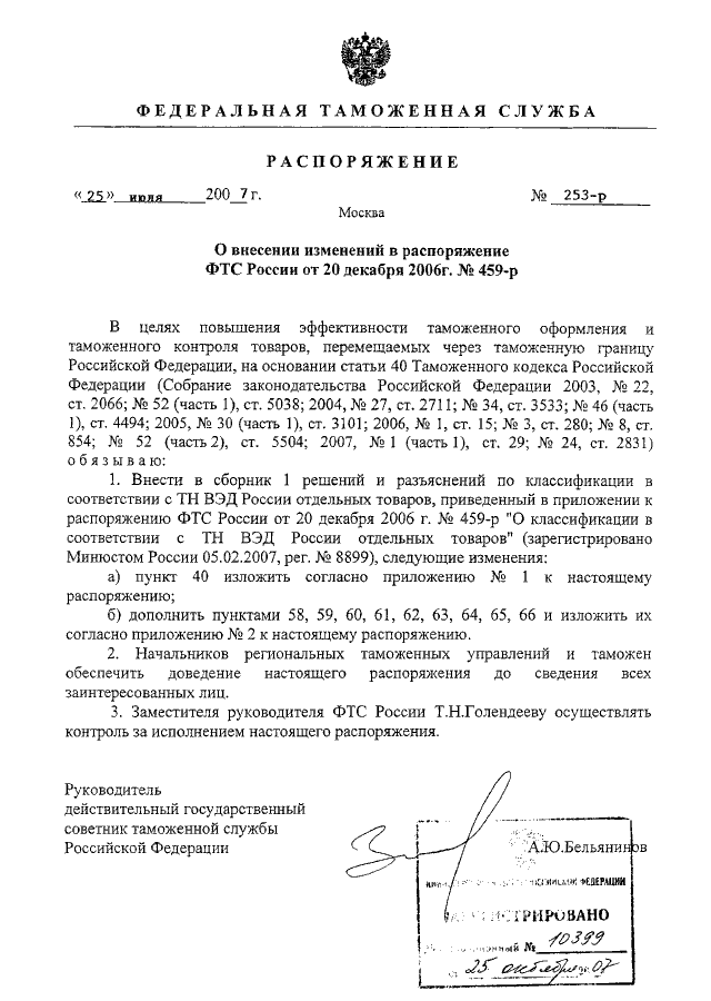 РАСПОРЯЖЕНИЕ ФТС РФ от 25.07.2007 N 253-р