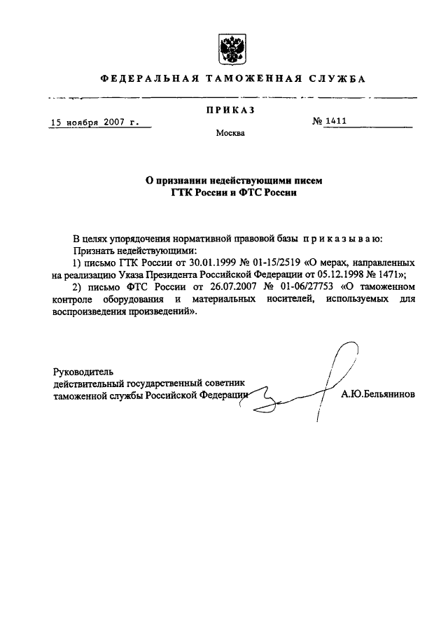 ПРИКАЗ ФТС РФ от 15.11.2007 N 1411