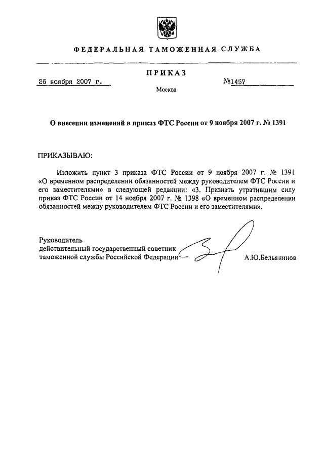 ПРИКАЗ ФТС РФ от 26.11.2007 N 1457