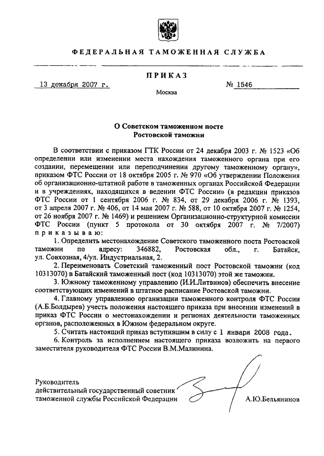 ПРИКАЗ ФТС РФ от 13.12.2007 N 1546