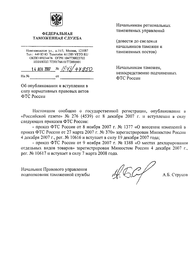 "ОБ ОПУБЛИКОВАНИИ И ВСТУПЛЕНИИ В СИЛУ НОРМАТИВНЫХ ПРАВОВЫХ АКТОВ ФТС РОССИИ"