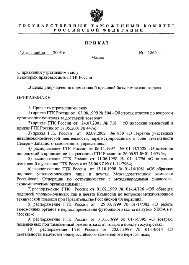 ПРИКАЗ ГТК РФ от 12.11.2003 N 1269